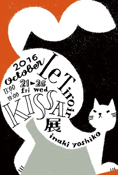 "KISSA"はフィンランド語で猫。イラストレーションの展示と、猫にまつわるものの販売、金沢・東出珈琲店のKISSAブレンド、unpeuのKISSA FOODもご用意します。イナキヨシコの"キッサテン"へぜひ。
